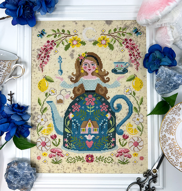 Make this pretty tea-themed chart with the lovely Tea Goddess, surrounded by lemons, flowers, cookies, mushrooms, tea cup and the moon.