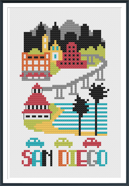 Réalisez une version au point de croix de San Diego, la « Ville du Destin », avec le pont Coronado, le musée de l'Homme de San Diego, l'hôtel Coronado, l'hôtel El Cortez, le bâtiment Keating et la chaîne de montagnes.