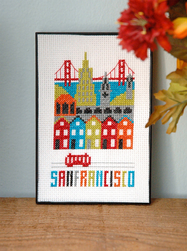 Créez une scène de San Francisco avec le Golden Gate Bridge, le Ferry Building sur l'Embarcadero, la Transamerica Tower, le Palace of Fine Arts Theatre, la Coit Tower et plusieurs des dames peintes (maisons) sur une toile Aida 14 fils.