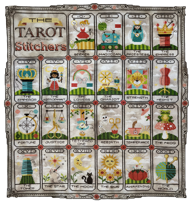 Welcome to our 2024 yearlong Stitch-A-Long! This design is a cute Tarot sampler featuring the 22 Major Arcana cards, specially designed for stitchers and crafters (pins, needles, floss, scissors, hoops, cute animals and characters etc.)